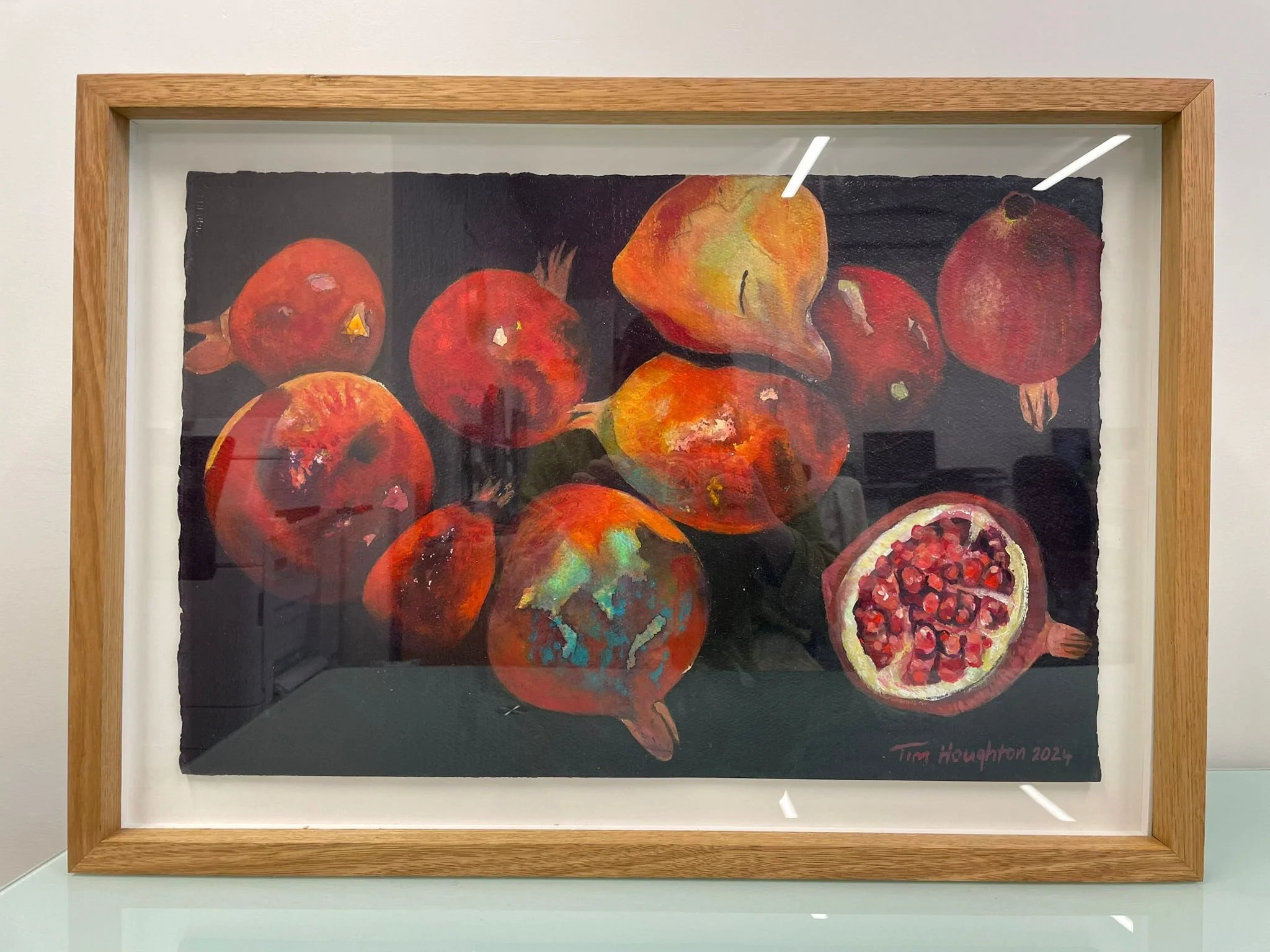 Experience the beauty of vibrant colours and intricate shapes with this stunning painting of pomegranates. The artwork captures a dynamic quality in the spaces between each piece of fruit, creating a sense of movement and depth. Some areas beautifully fade into a dark background, highlighting the rich textures and forms of the pomegranates. According to ancient Iranian Christianity, the pomegranate is believed to have been found in the Garden of Eden and is often thought to be the true 'forbidden fruit' rather than the apple. Medium: Acrylic on paper.